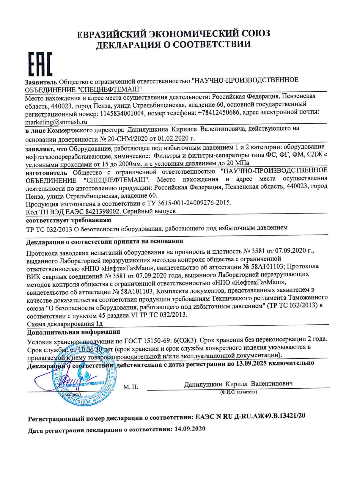Таможенный союз. Декларация о соответствии: фильтры и фильтры-сепараторы типа ФС, ФГ, ФМ, СДЖ