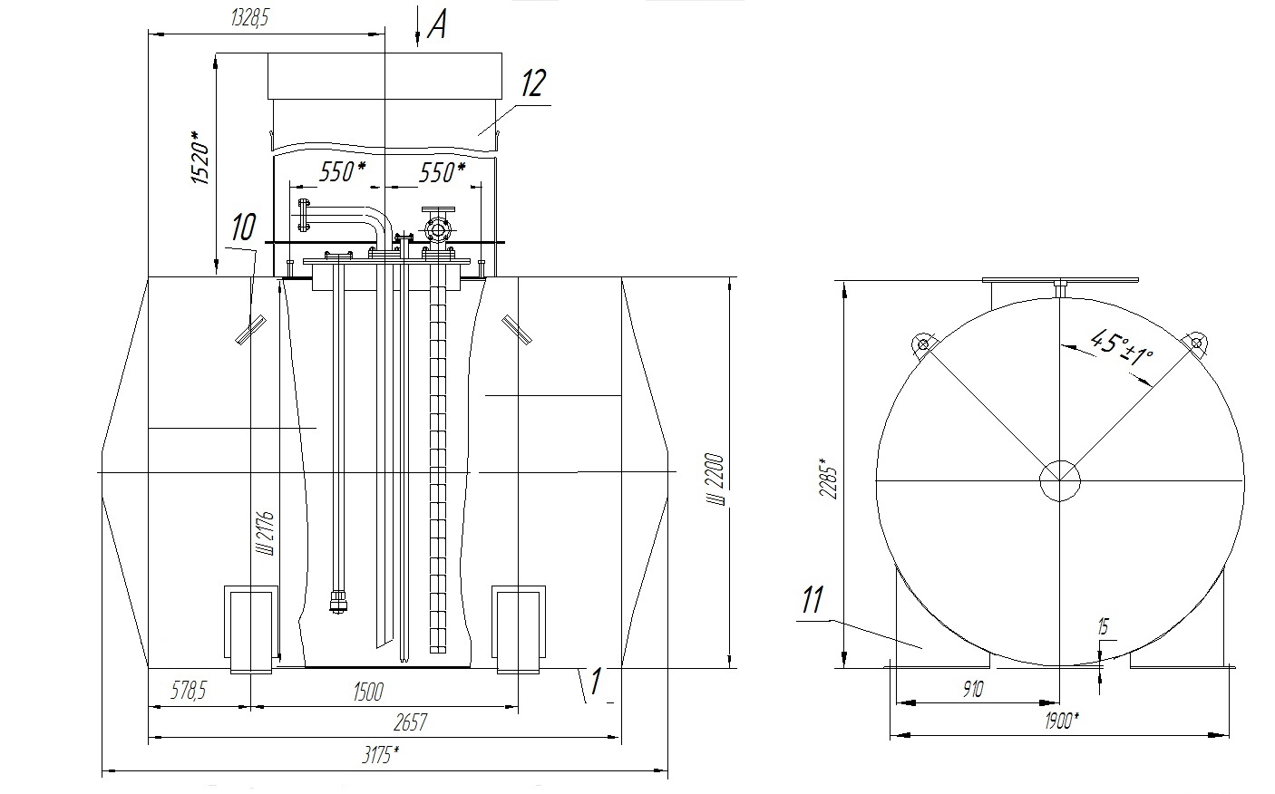 Двустенный резервуар РГСПД — это две отдельных емкости, размещенных одна в другой таким образом, чтобы между стенками оставался зазор от 4 мм, а пространство было герметичным и заполнено азотом (допустим другой инертный газ) или незамерзающей жидкостью (тосол, антифриз).
